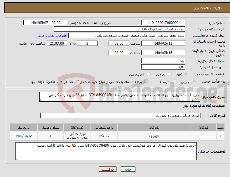 تلویزیون 55 اینچ مطابق مشخصات پیوستی