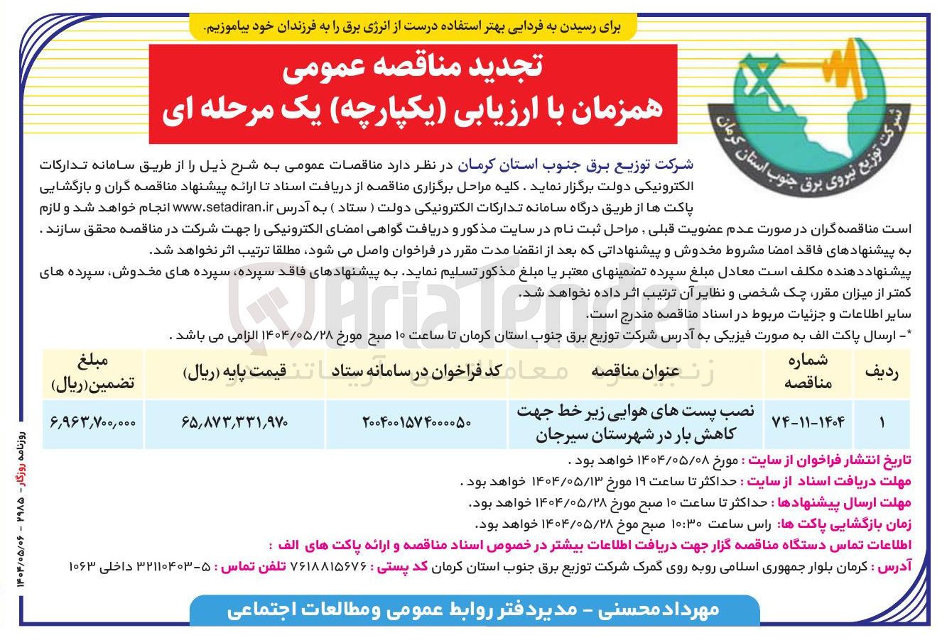 ارسال پاکت الف به صورت فیزیکی به آدرس شرکت توزیع برق جنوب استان کرمان تا ساعت ۱۰ صبح مورخ ۱۴۰۴/۰۵/۲۸ الزامی می باشد .