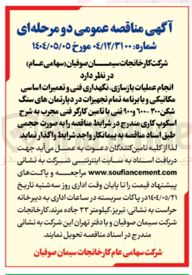 لذا از کلیه تامین کنندگان دعوت به عمل می آید جهت دریافت اسناد به سایت اینترنتی شرکت به نشانی www.soufiancement.com مراجعه و پاکتهای پیشنهاد قیمت را تا پایان وقت اداری روز سه شنبه تاریخ ١٤٠٤/٠٥/٢١ در پاکات سربسته در ساعات اداری به دبیرخانه حراست به نشانی تبریز کیلومتر ۳۳ جاده مرند کارخانجات شرکت سیمان صوفیان و یا دفتر تهران این شرکت به نشانی مندرج در اسناد مناقصه تحویل نمایند .