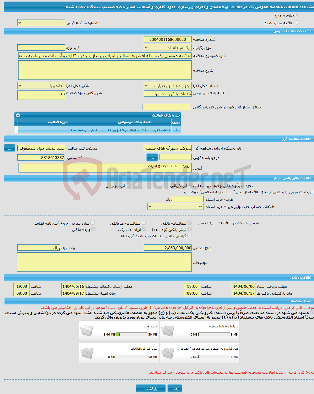 مناقصه عمومی یک مرحله ای تهیه مصالح و اجرای زیرسازی،جدول گذاری و آسفالت معابر ناحیه صنعتی سندگان-تجدید شده