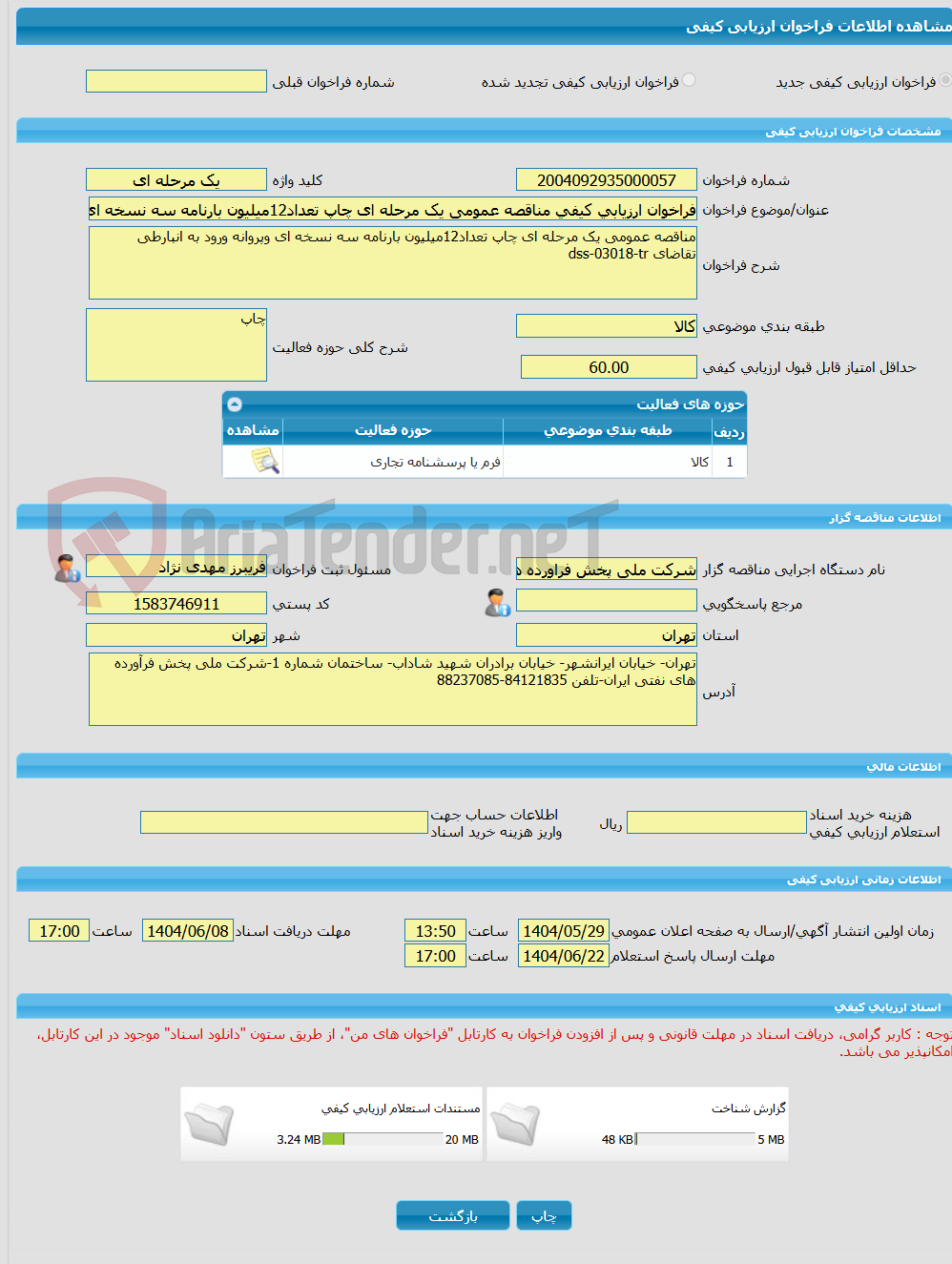 مناقصه عمومی یک مرحله ای چاپ تعداد12میلیون بارنامه سه نسخه ای وپروانه ورود به انبارطی تقاضای dss-03018-tr