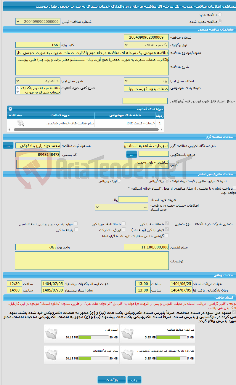 مناقصه عمومی یک مرحله ای مناقصه مرحله دوم واگذاری خدمات شهری به صورت حجمی  طبق پیوست