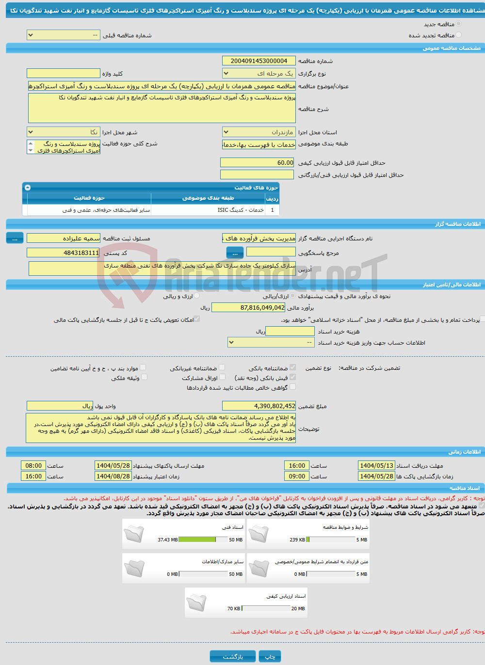 مناقصه عمومی همزمان با ارزیابی (یکپارچه) یک مرحله ای پروژه سندبلاست و رنگ آمیزی استراکچرهای فلزی تاسیسات گازمایع و انبار نفت شهید تندگویان نکا